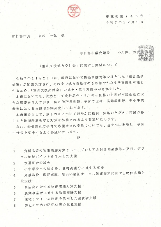 12月議会「重点支援地方交付金」に関して要望を提出